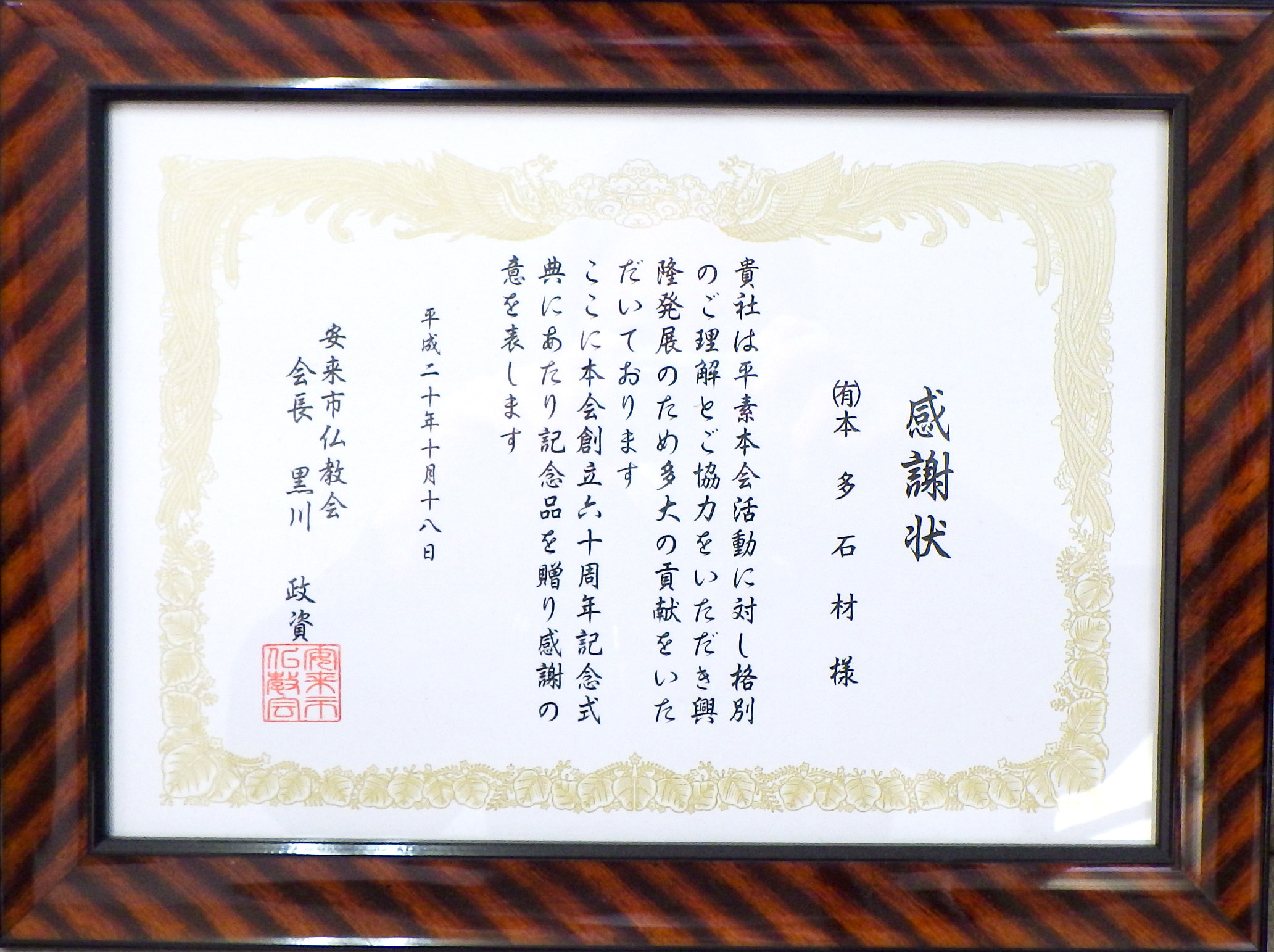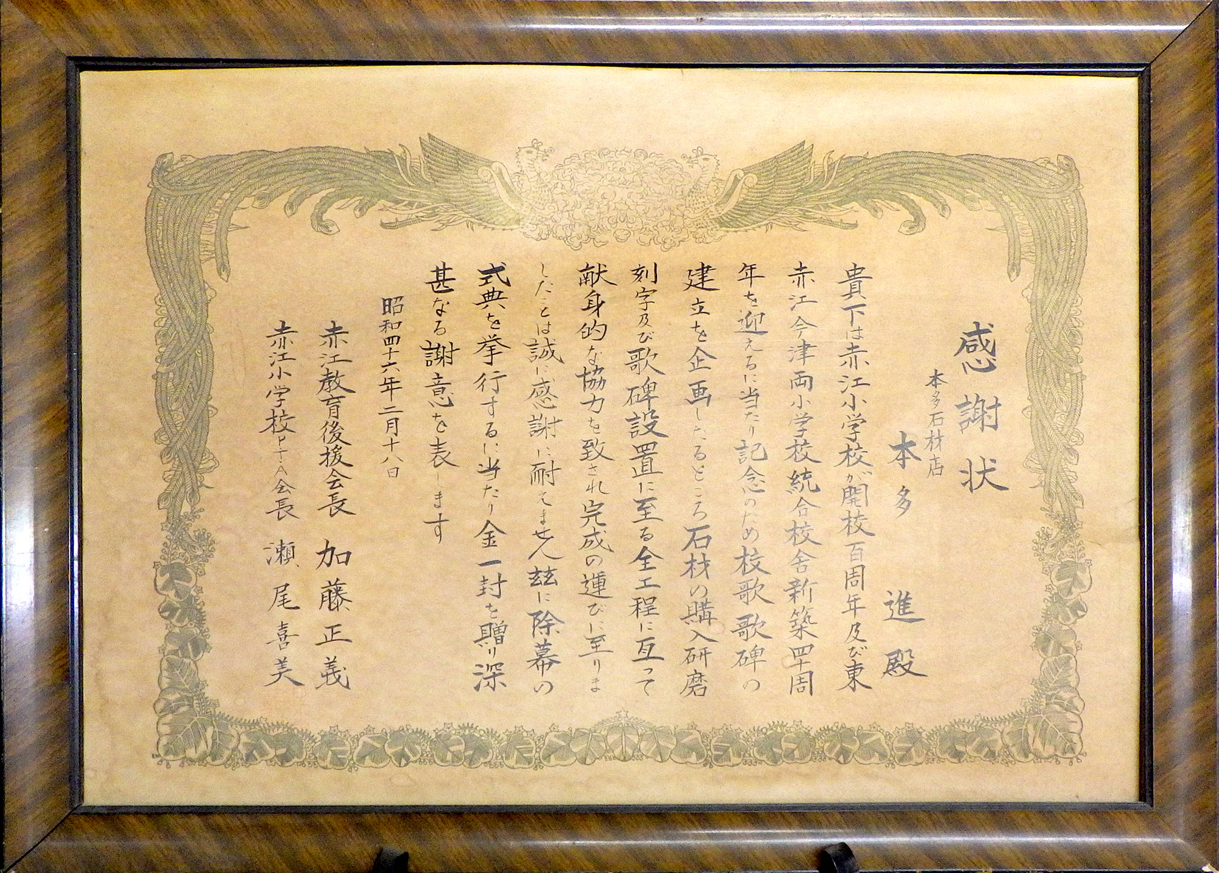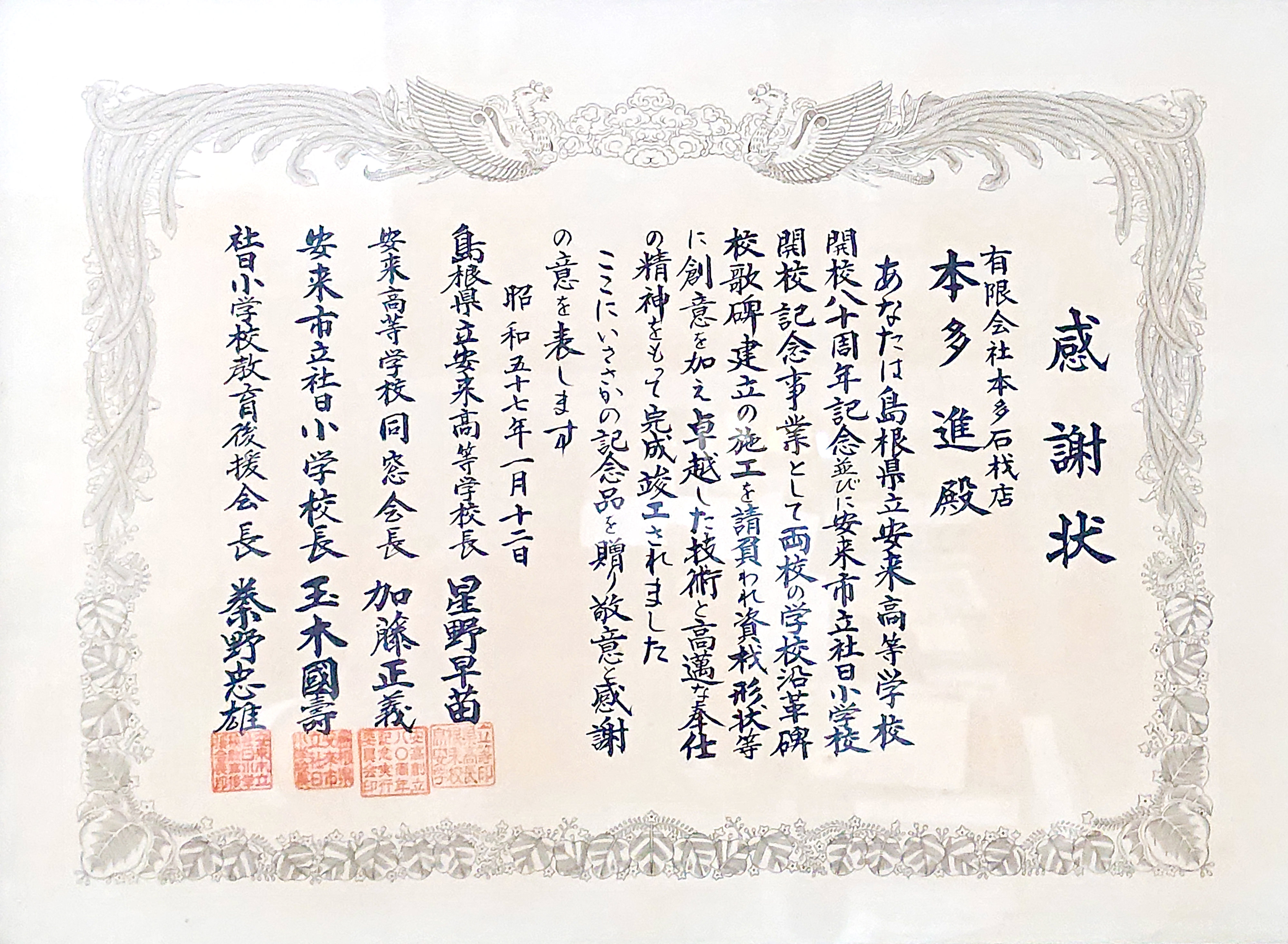 お陰様で弊社は創業90年を超え、安来市を中心とした地域の皆様に支えられて、これまで多くの慰霊碑・石碑を建立させて頂きました。ここでは、皆様より頂きました感謝状・表彰状の一部を掲載させて頂きます。この表彰・感謝状を賜った人々に驕ることのないようより一層精進し、地域の皆様に貢献出来るように日々取り組んで参ります。
