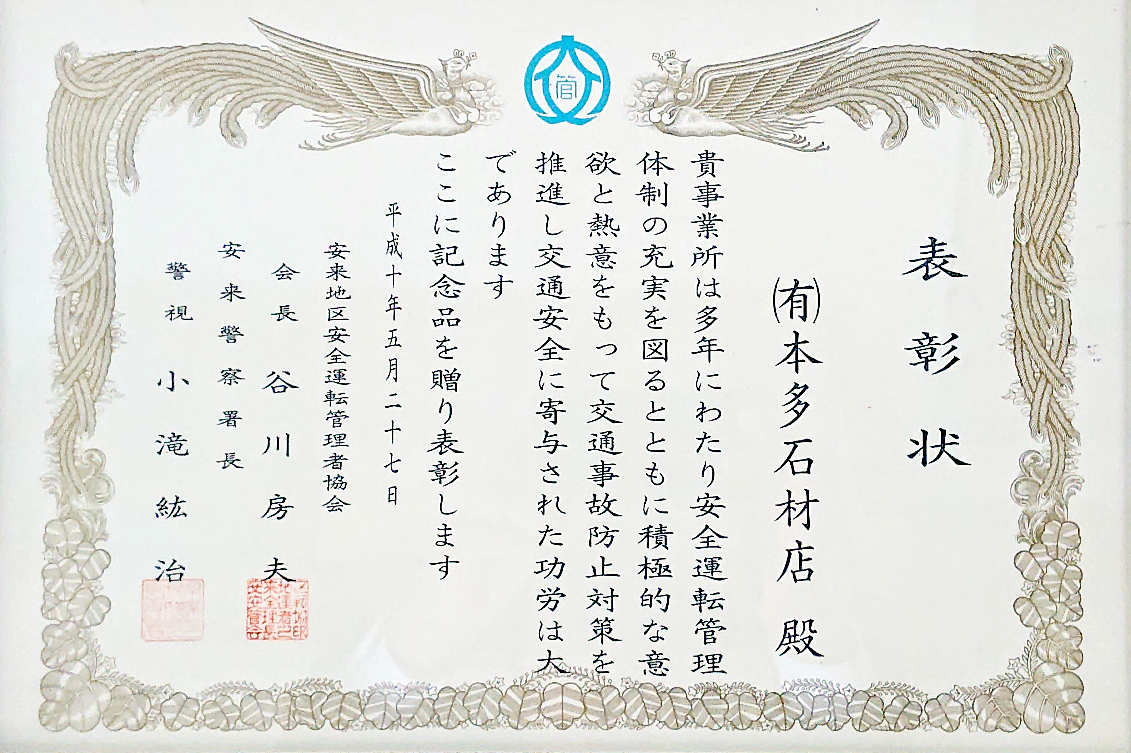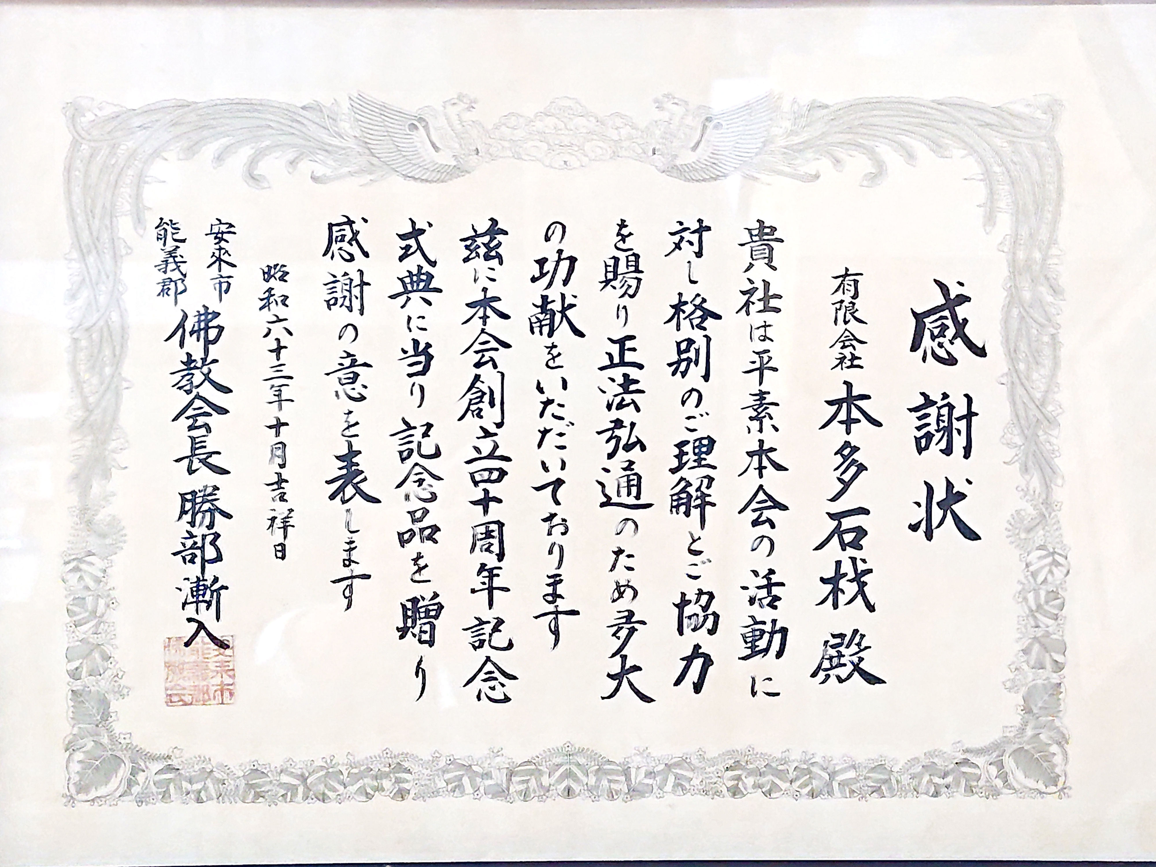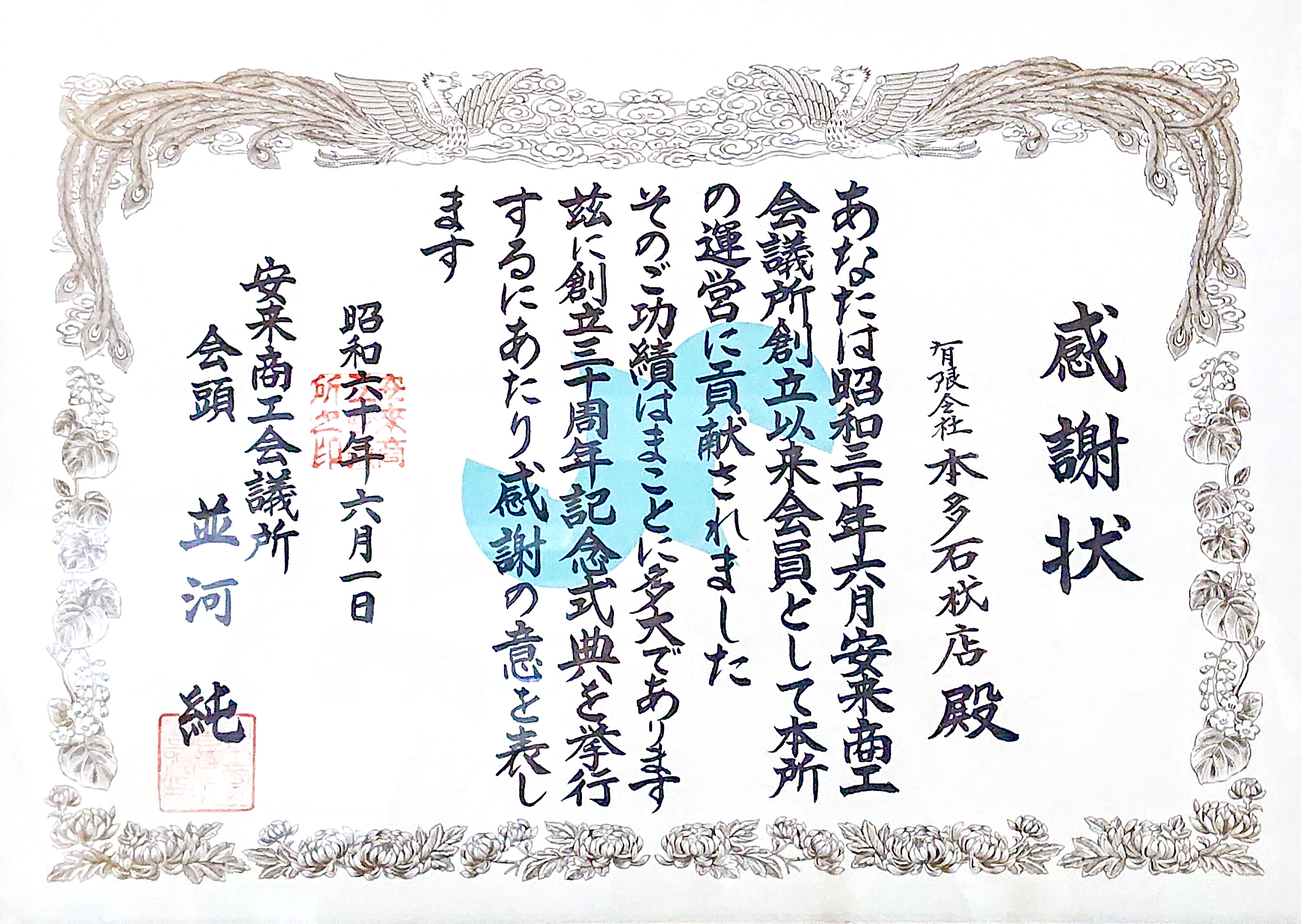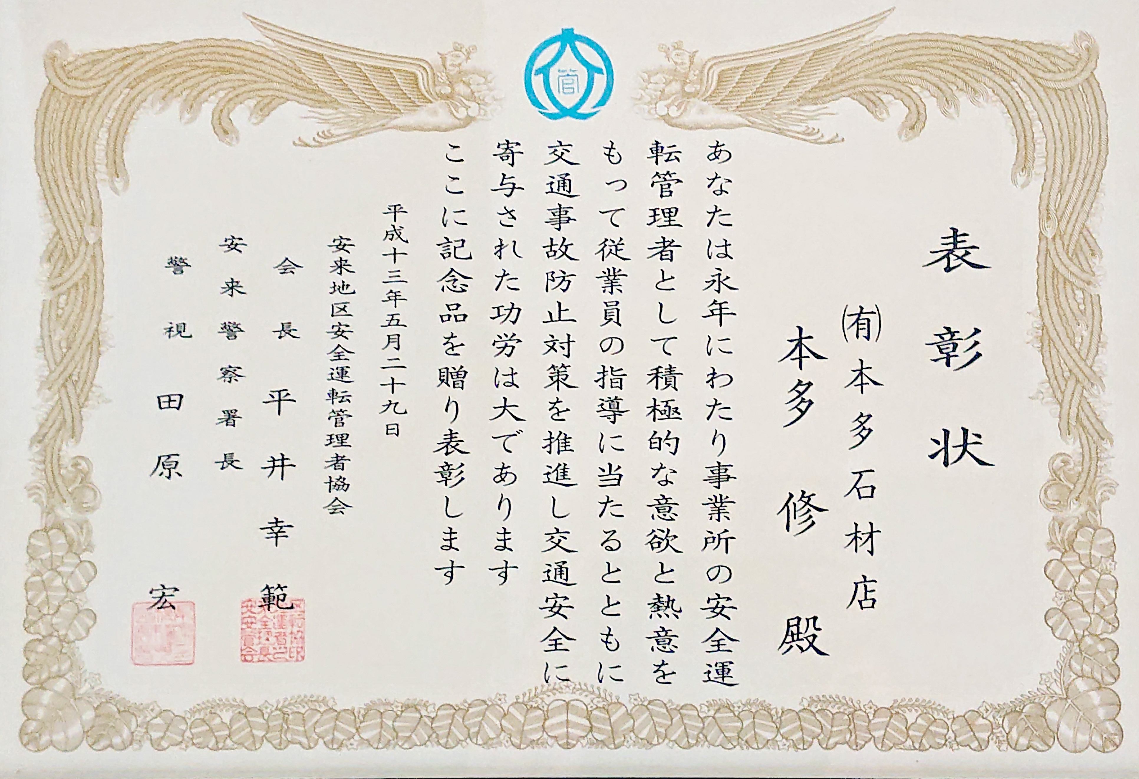お陰様で弊社は創業90年を超え、安来市を中心とした地域の皆様に支えられて、これまで多くの慰霊碑・石碑を建立させて頂きました。ここでは、皆様より頂きました感謝状・表彰状の一部を掲載させて頂きます。この表彰・感謝状を賜った人々に驕ることのないようより一層精進し、地域の皆様に貢献出来るように日々取り組んで参ります。