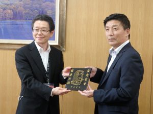 ■安来第一中学校にオーディオラックとアマビエの彫刻プレートを寄贈させていただきましたp>